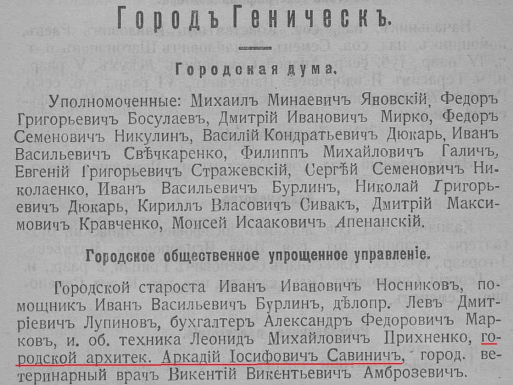 Можно сказать, что Геническу очень повезло, когда в 1916 году должность первого в истории городского архитектора получил именно А.И.Савинич, который вплоть до революции жил и работал в нашем городе. Что же знает Геническ о Савиниче, какими его работами может похвалиться в пример Оренбургу и Симферополю?