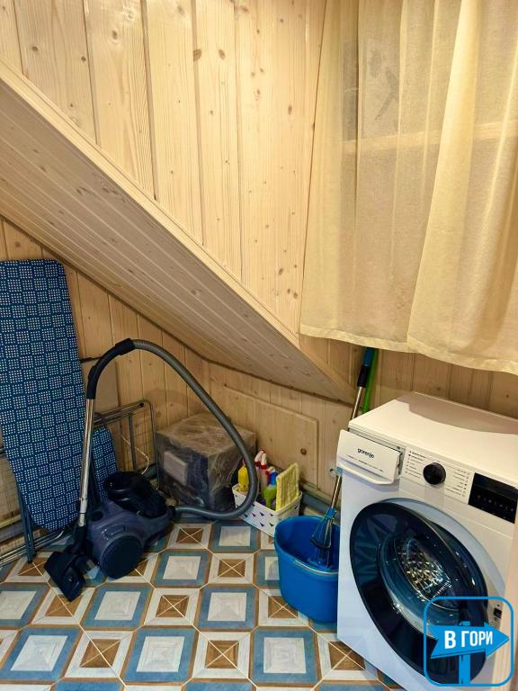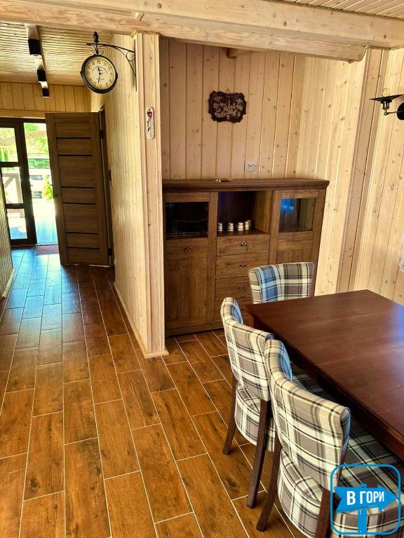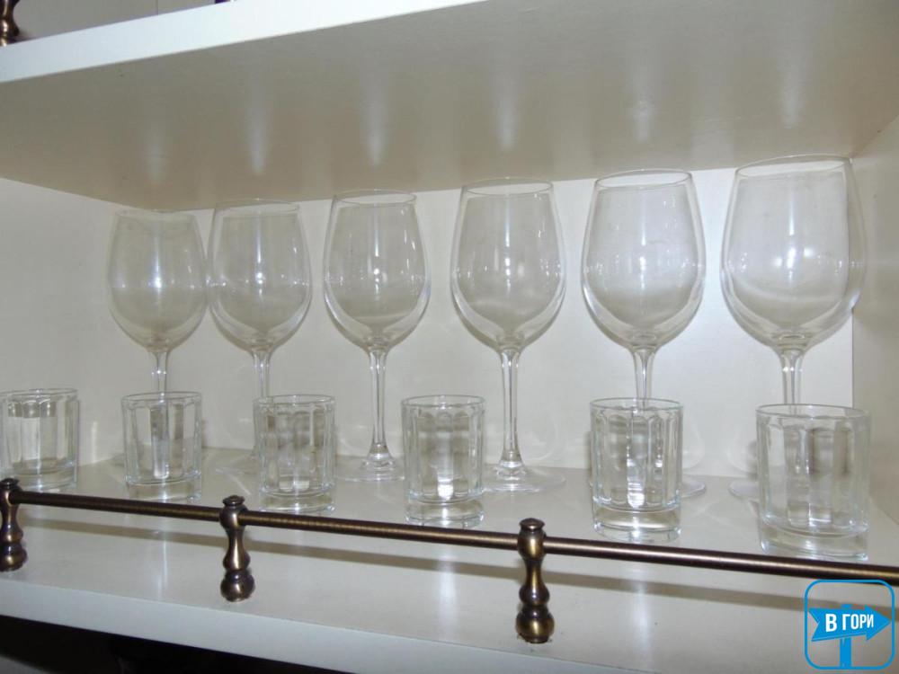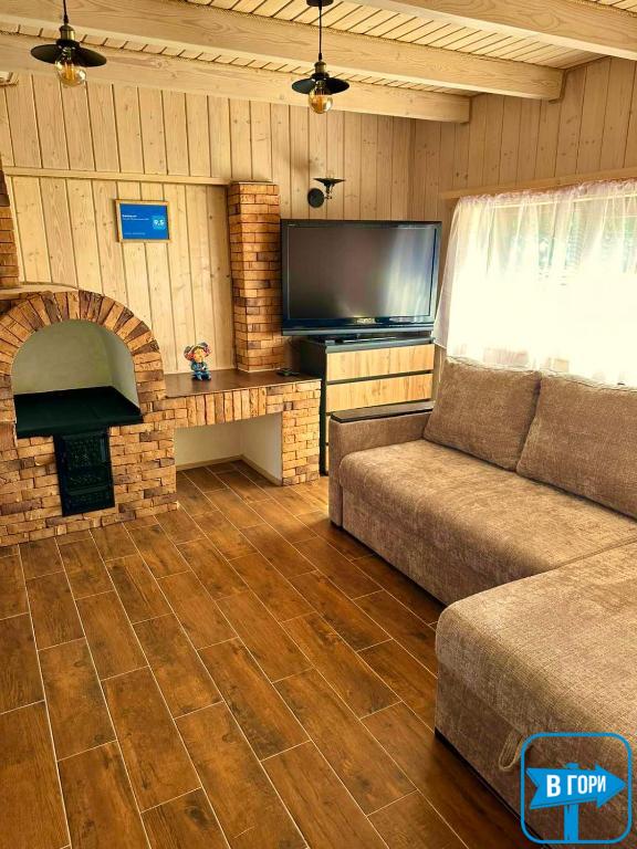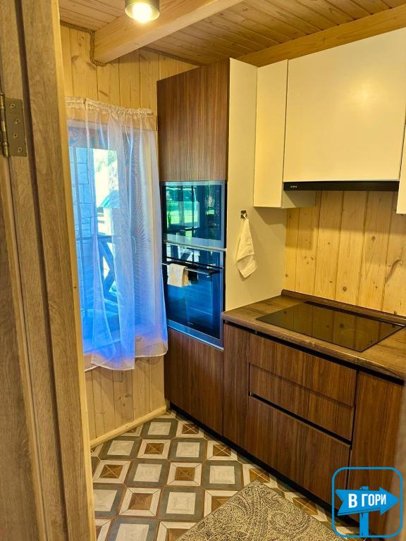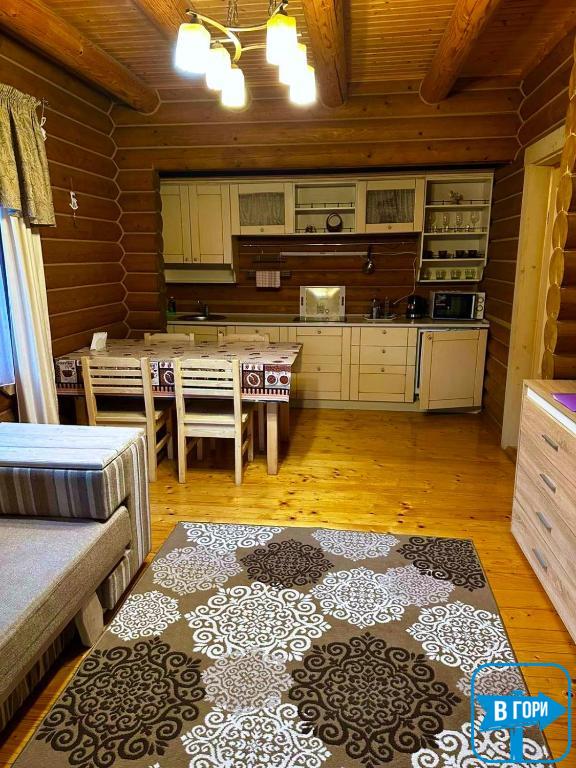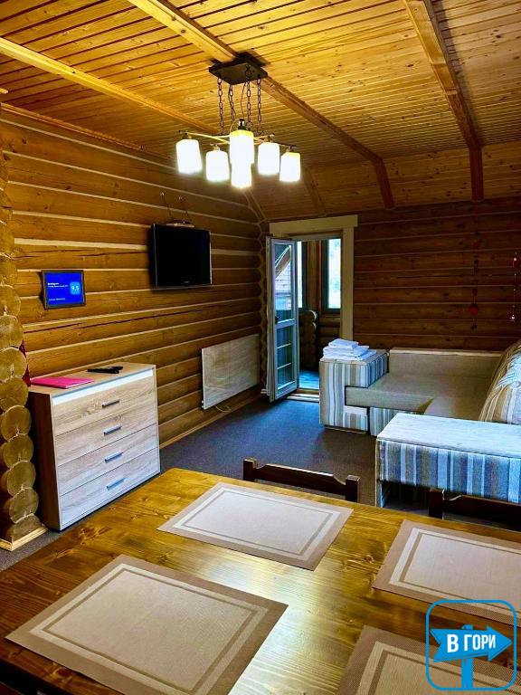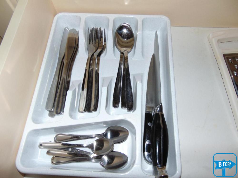 - Кухня-вітальня (електрична плита, мікрохвильова піч, холодильник, електрочайник, мийка, посуд, обідній стіл, розкладний диван, комод, телевізор);