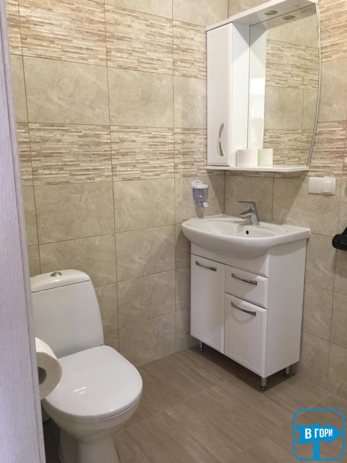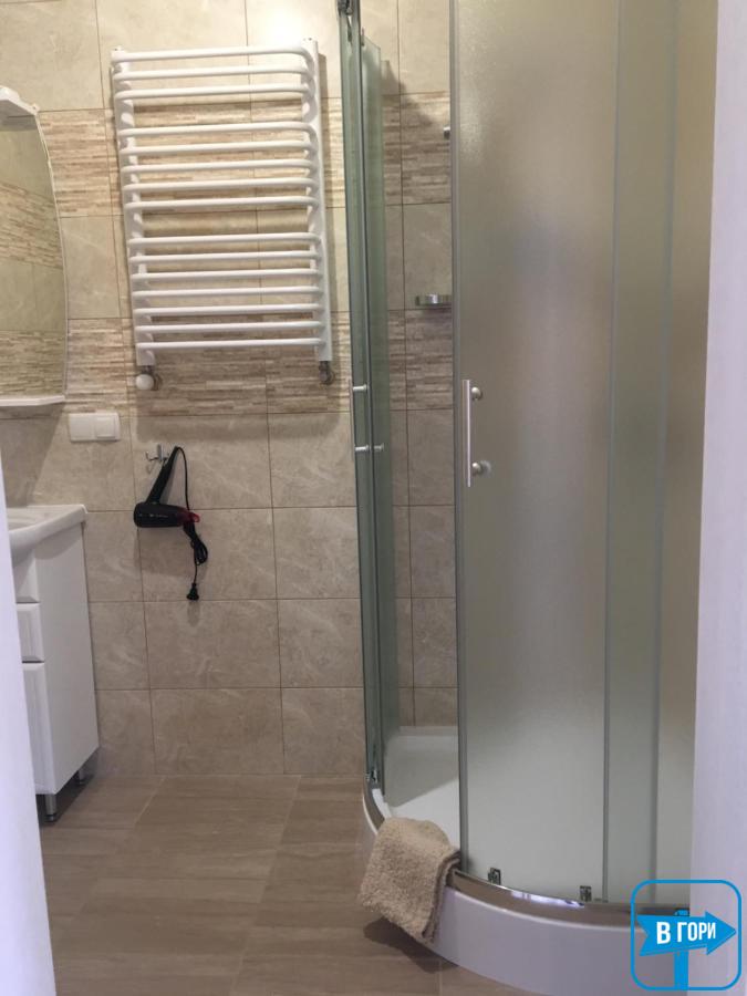 Рядом с кухней расположена двухместная комната с удобной двуспальной кроватью и телевизором, а санузел с душевой кабиной, туалетом, биде и умывальником обеспечит комфорт.
