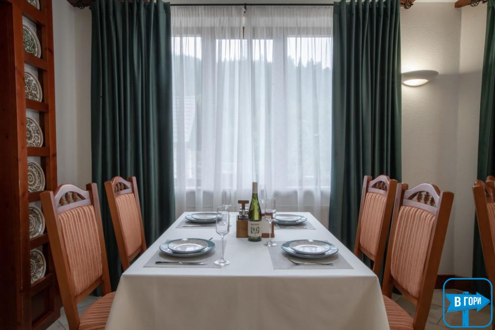 На первом этаже отеля находится ресторан, где можно заказать любимые блюда и напитки. Из ресторана есть выход на летнюю террасу с видом на реку и горы.