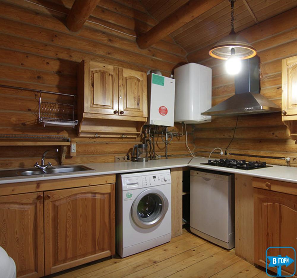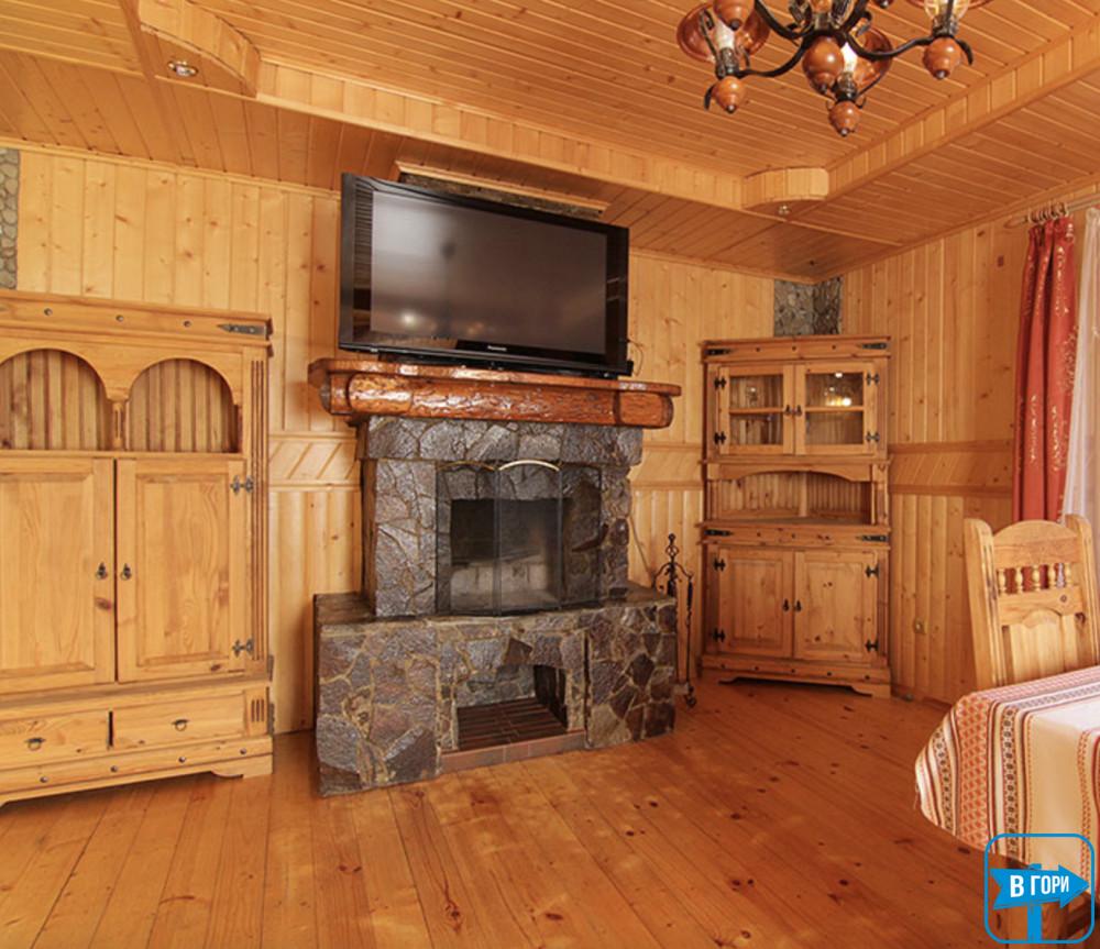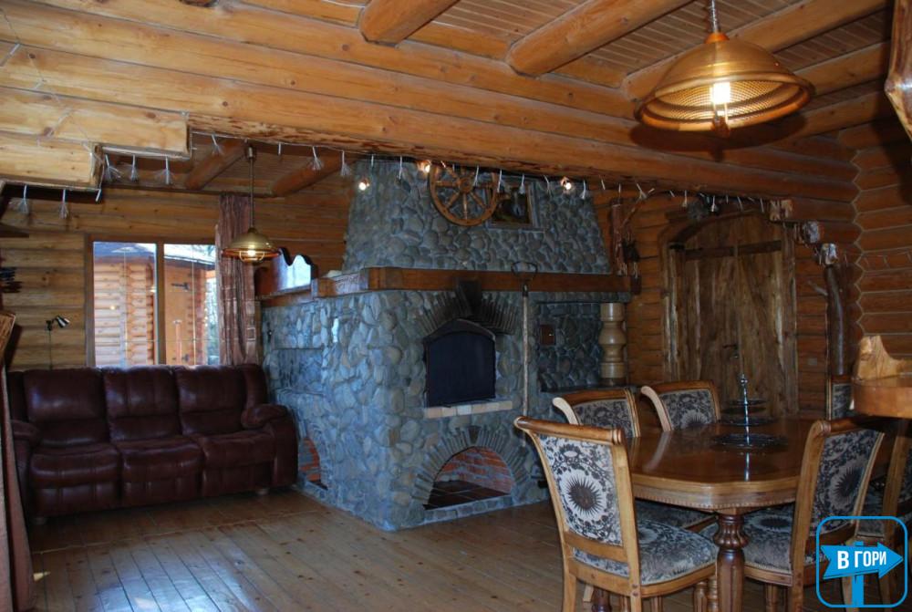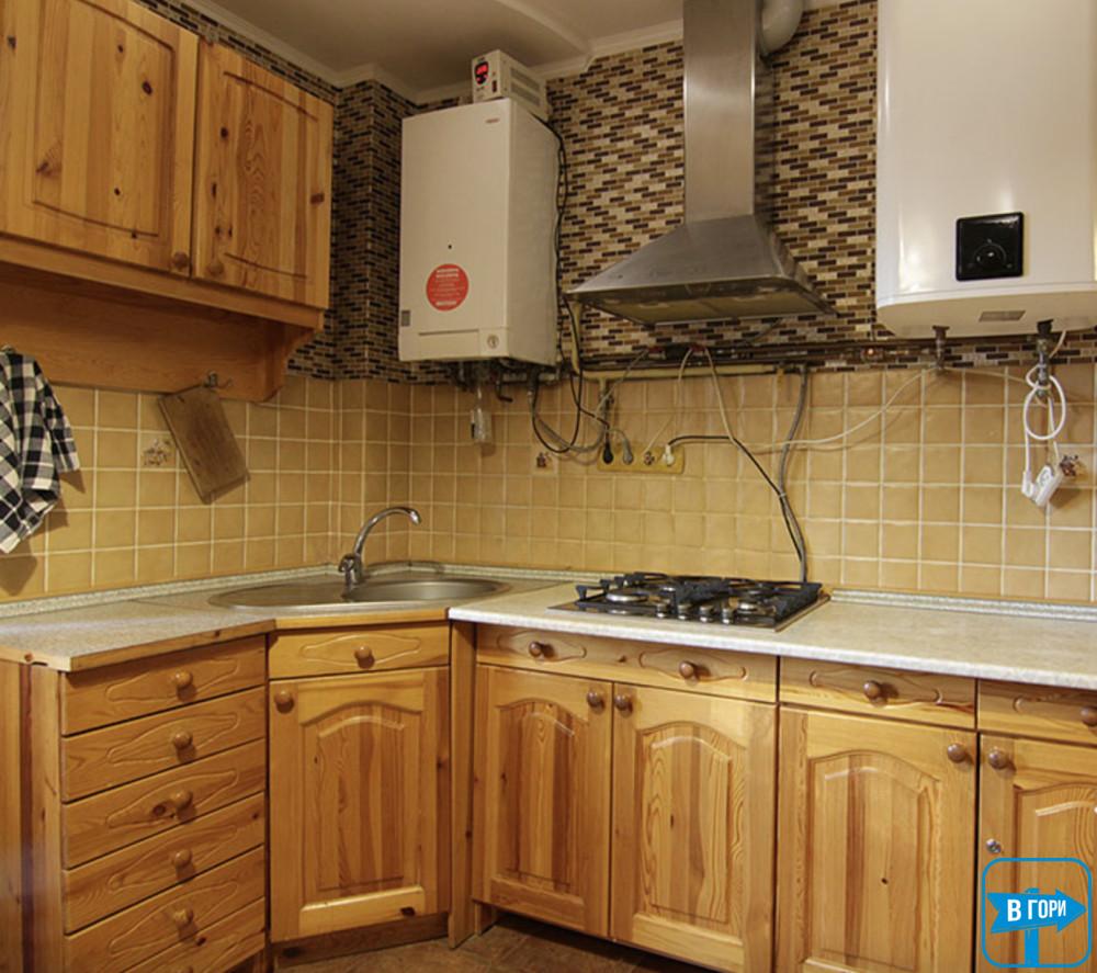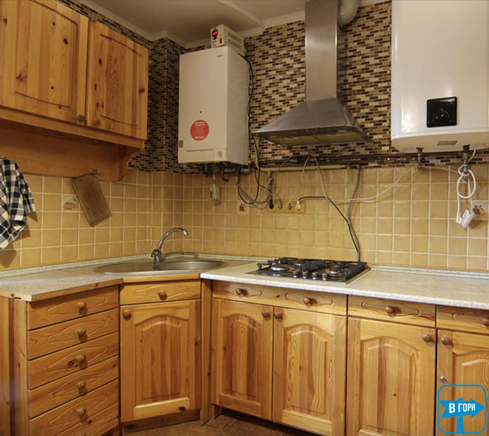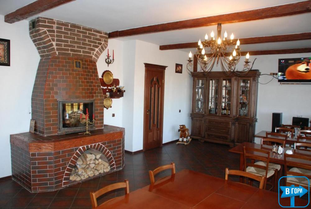 На первом этаже - апартаменты "Краєвид" кухня (газовая плита, холодильник, мойка, электрочайник, посудомоечная и стиральная машины), каминный зал (двуспальный раскладной диван, печь, обеденный стол, барная стойка, балкон), санузел (туалет, умывальник, душевая кабина).