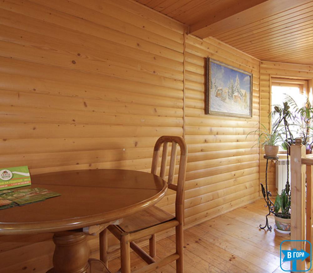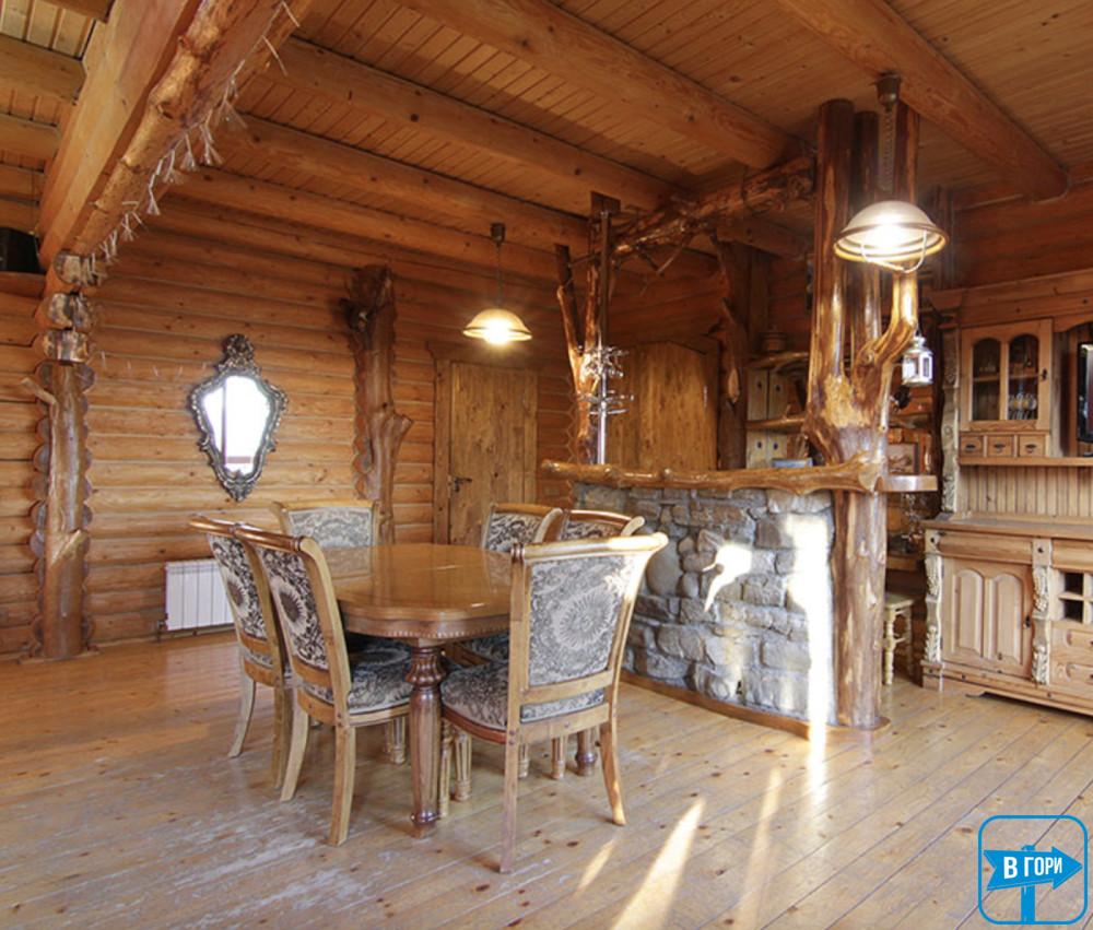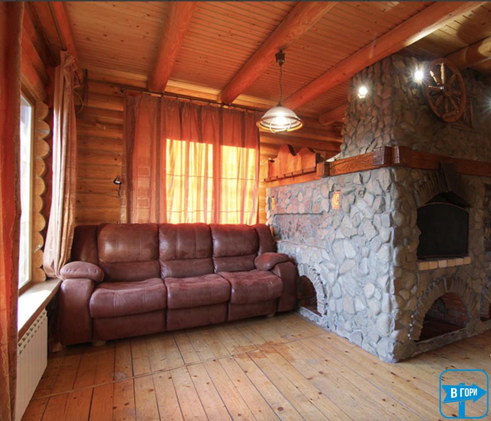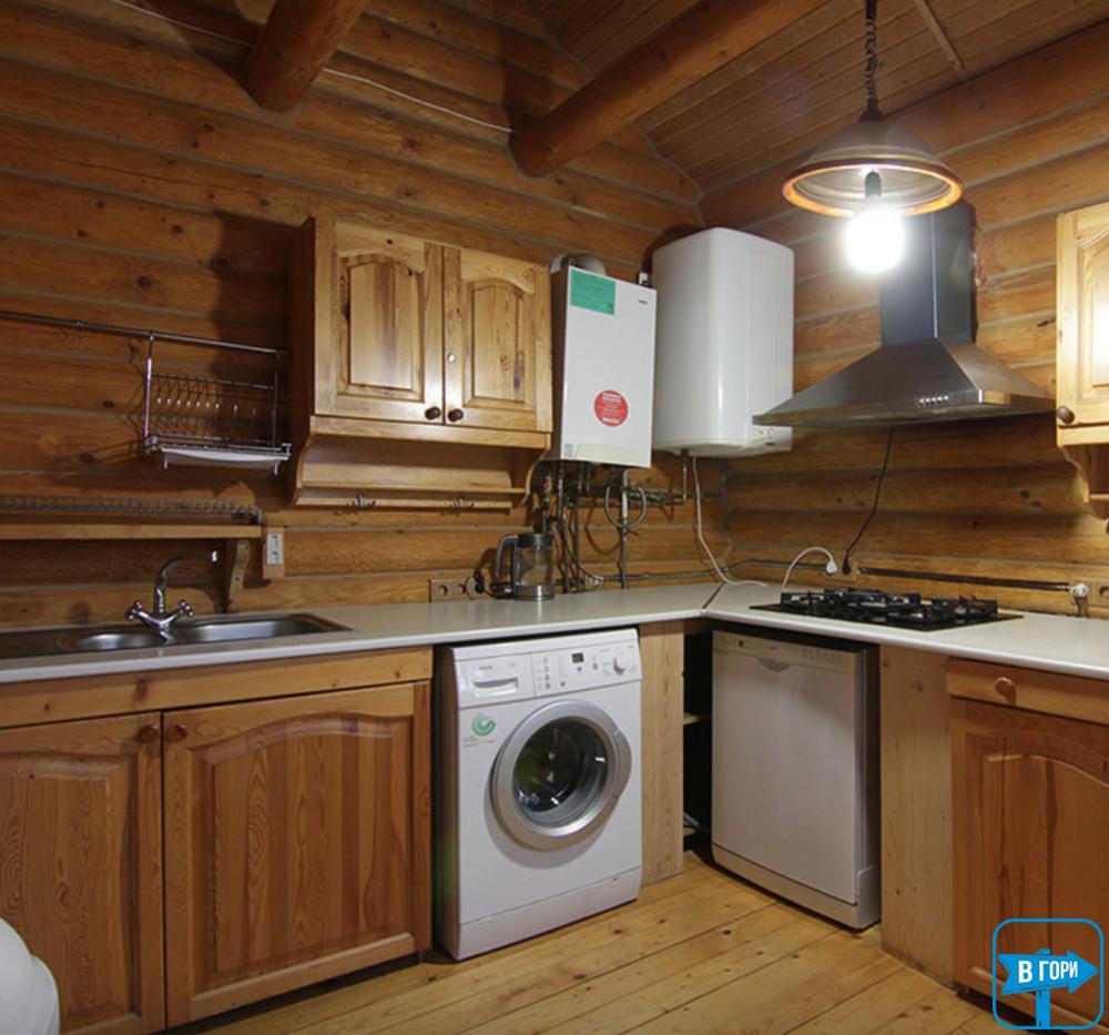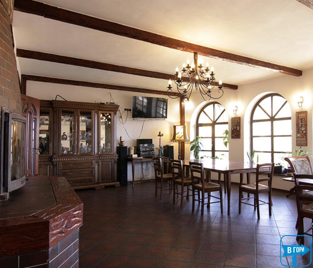 На первом этаже - апартаменты "Краєвид" кухня (газовая плита, холодильник, мойка, электрочайник, посудомоечная и стиральная машины), каминный зал (двуспальный раскладной диван, печь, обеденный стол, барная стойка, балкон), санузел (туалет, умывальник, душевая кабина).