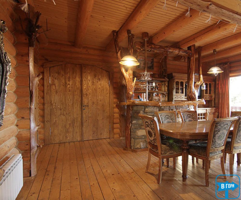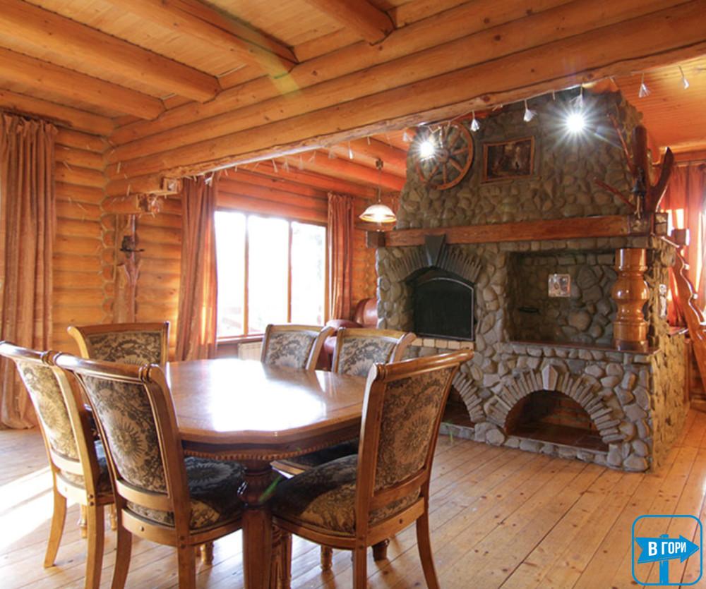 На первом этаже - апартаменты "У камина" - каминный зал (камин, телевизор, раскладной диван, обеденный стол, комод), кухня (плита, холодильник, электрочайник, набор посуды), спальня (двуспальная кровать, комод), раздельный санузел (душевая) кабина, умывальник, стиральная машина и туалет); терраса (стол со стульями, лежаки).