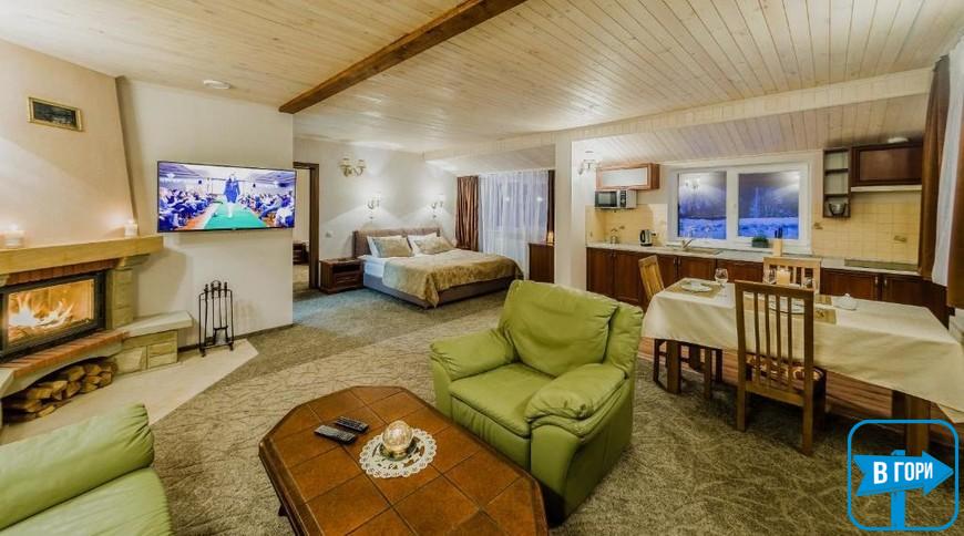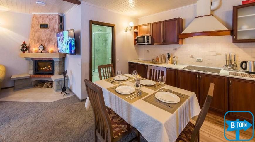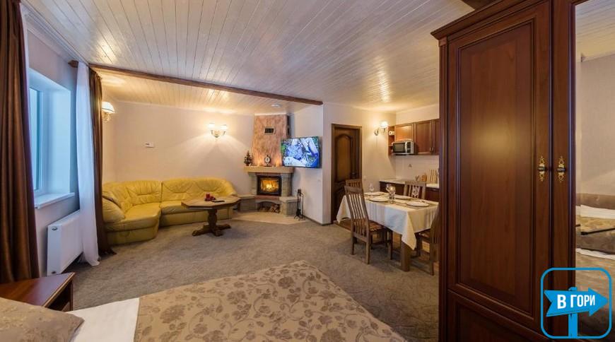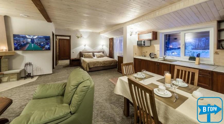 У номері-студіо є вітальня з відкритим каміном і РК-телевізором, а також повністю обладнана кухня та обідня зона.