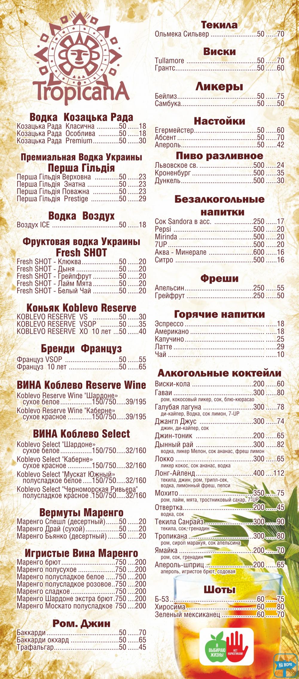Tropicana – місце, де можна поїсти, випити та покурити кальян. Зовсім поряд із морем. Тут комплексні сніданки, обіди та вечері. Знижки, акції та гарний настрій. Увечері жива музика та ще ширше меню. Зовсім поруч VIP-готель та економ-готель Куба, кафе «У Ксюші», готель Міленіум. Це приблизно середина Курортного проспекту з/відпочинку Коблево. Смачного!